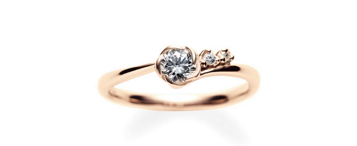 センターダイヤモンドを留める爪を巻き込んだ形にすることで、花びらのようなデザインに仕上げたエンゲージリング。アシンメトリーに配置されたメレ石は、ダイヤモンドやピンクサファイアでアレンジが可能です。きゃしゃな緩いSラインも素敵。ちなみに商品名「アスター」の花言葉は「信じる心」です。