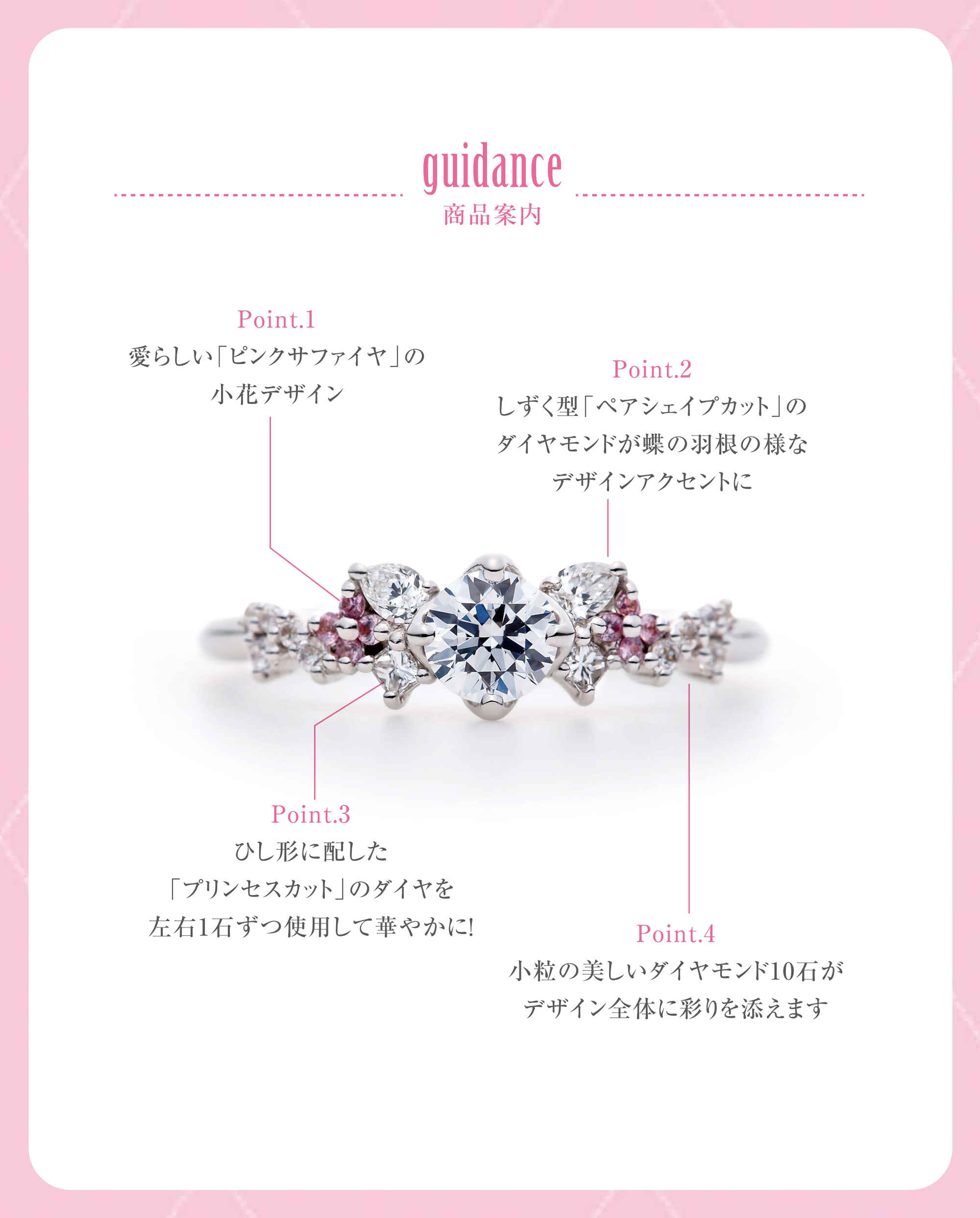 プラチナにピンクサファイヤの小花が映える大人可愛さが魅力的。