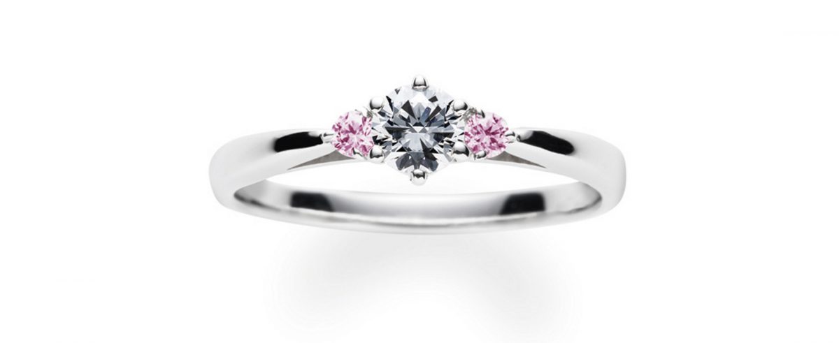 中央のダイヤモンドの両脇にそれぞれ1石ずつメレ石を配置したスタンダードなデザインですが、実際に着けてみるととても立体感があり美しく、選ばれる方が多いモデルです。ピンクゴールドは温かみのある雰囲気です。ちなみに商品名「ジャスミン」の花言葉は「幸福」です。