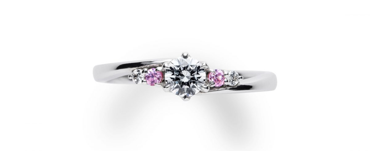 サイドの小粒石がピンクサファイヤのモデルもございます。華やかで可愛らしいです。¥218,000(税込)~