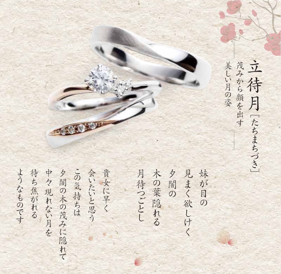 月に映した恋する想いをしたためた和歌の世界観を表現。その奥ゆかしく繊細な想いをデザインに込めて、優美なフォルムの婚約指輪が誕生しました。
