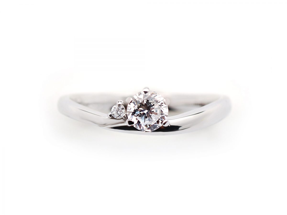 優しいウエーブラインの婚約指輪。センターダイヤの片側だけにメレダイヤをあしらったアシンメトリーのデザインがキュートなリングです。ちなみに商品名「ウォーターポピー」の花言葉は「水辺の美人」です。