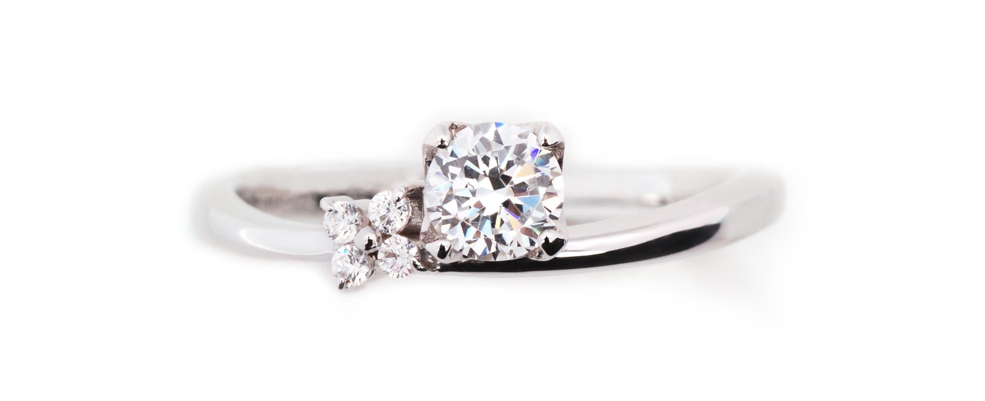 優しいウエーブラインの婚約指輪。センターダイヤを4本爪で留めているので、まるで四角いダイヤのようにも見えます。片側にお花の形にメレダイヤが4石あしらわれており、野バラという名前通りの可憐なデザインです。ちなみに商品名「野バラ」の花言葉は「純朴な愛」です。