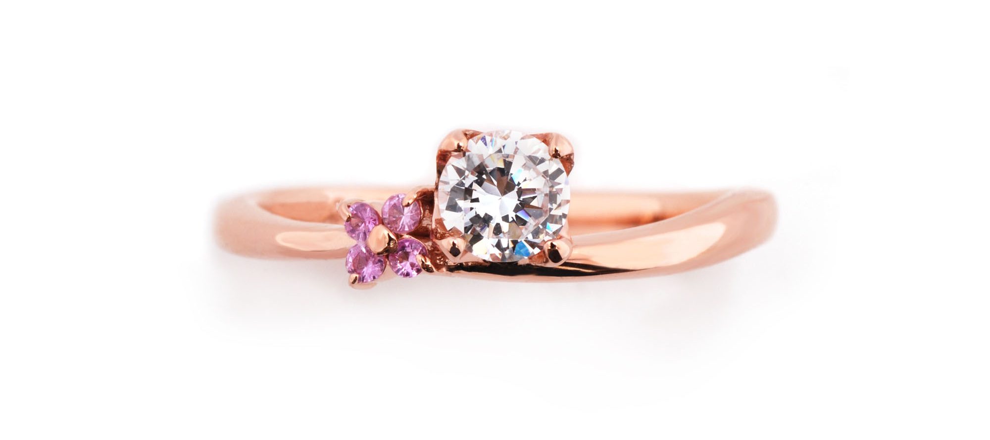 指輪の素材が18金ピンクゴールドで、サイドの小粒石がピンクサファイヤのモデルもございます。とても可愛らしく、華やかです。例)0.25カラットの場合¥259,000(税込)~