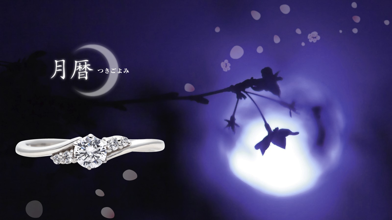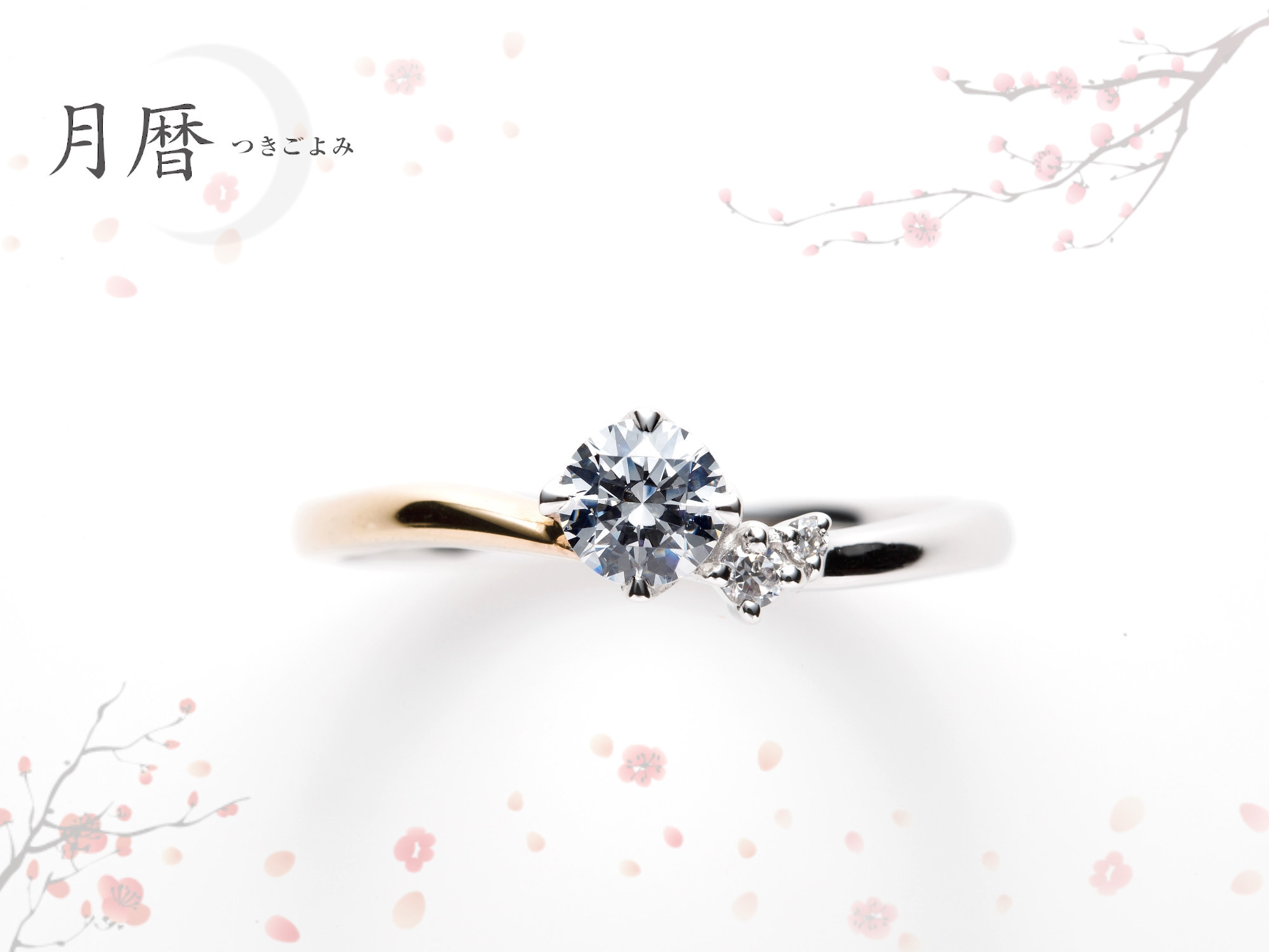 ブランド「月暦 -つきごよみ-」は、月に映した恋する想いをしたためた和歌の世界観を表現したものです。その奥ゆかしく繊細な想いをデザインに込めて、優美なフォルムの婚約指輪が誕生しました。