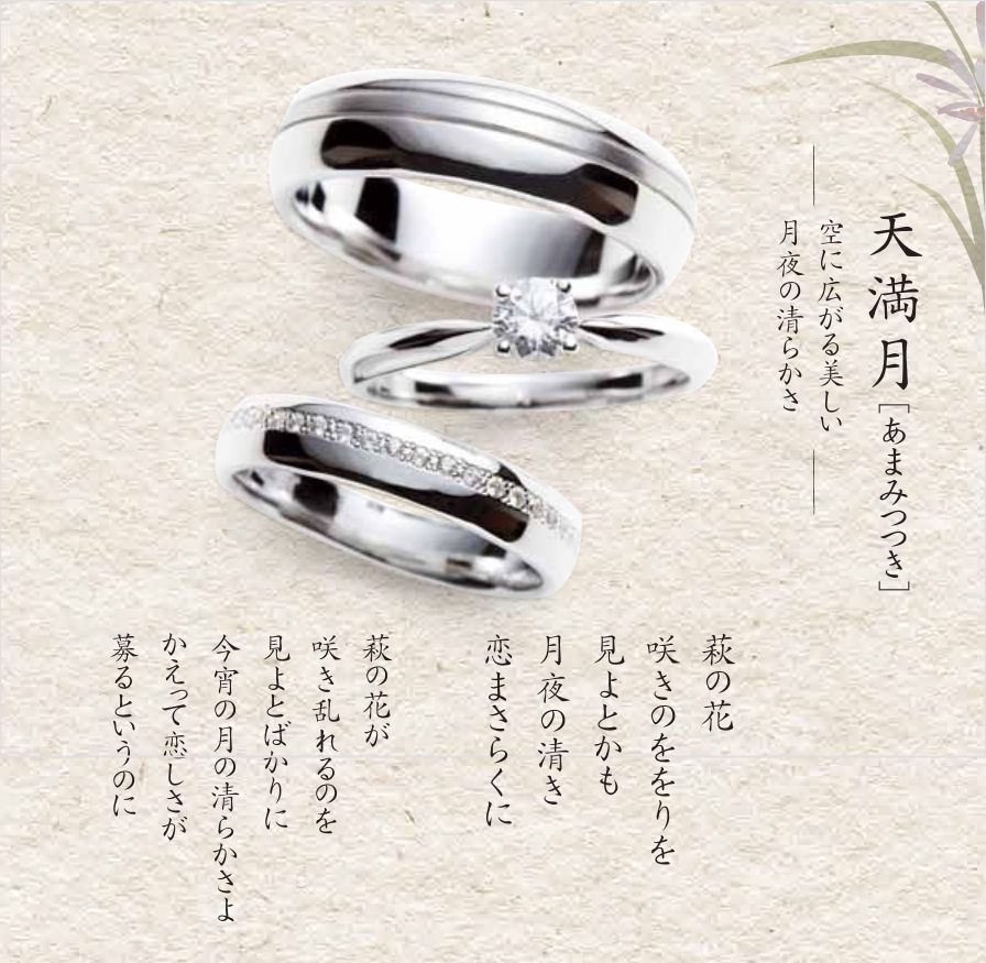 月暦のブライダルリングはひとつひとつに「月と恋」を詠った和歌があり、その内容をイメージしてデザインされています。