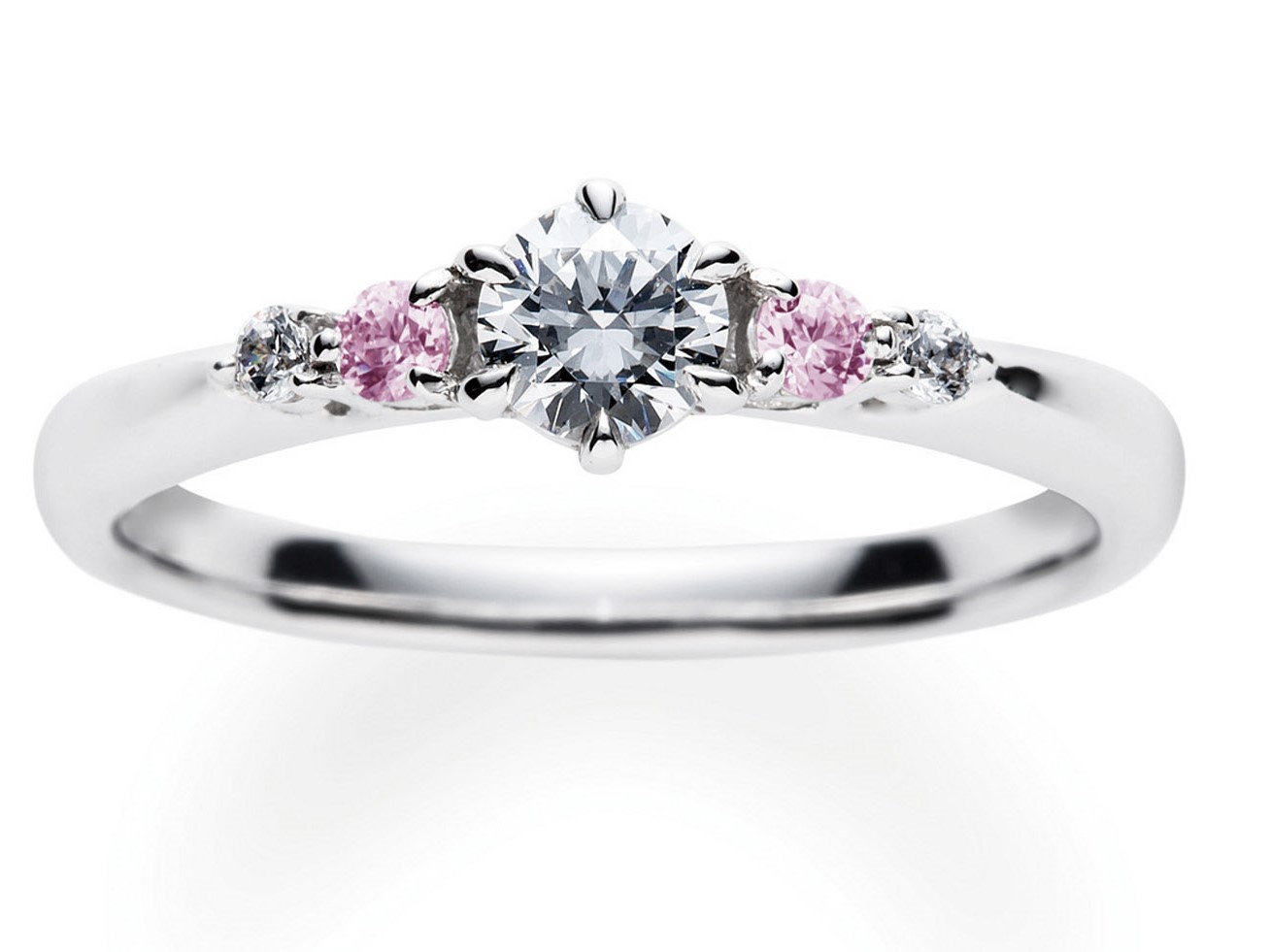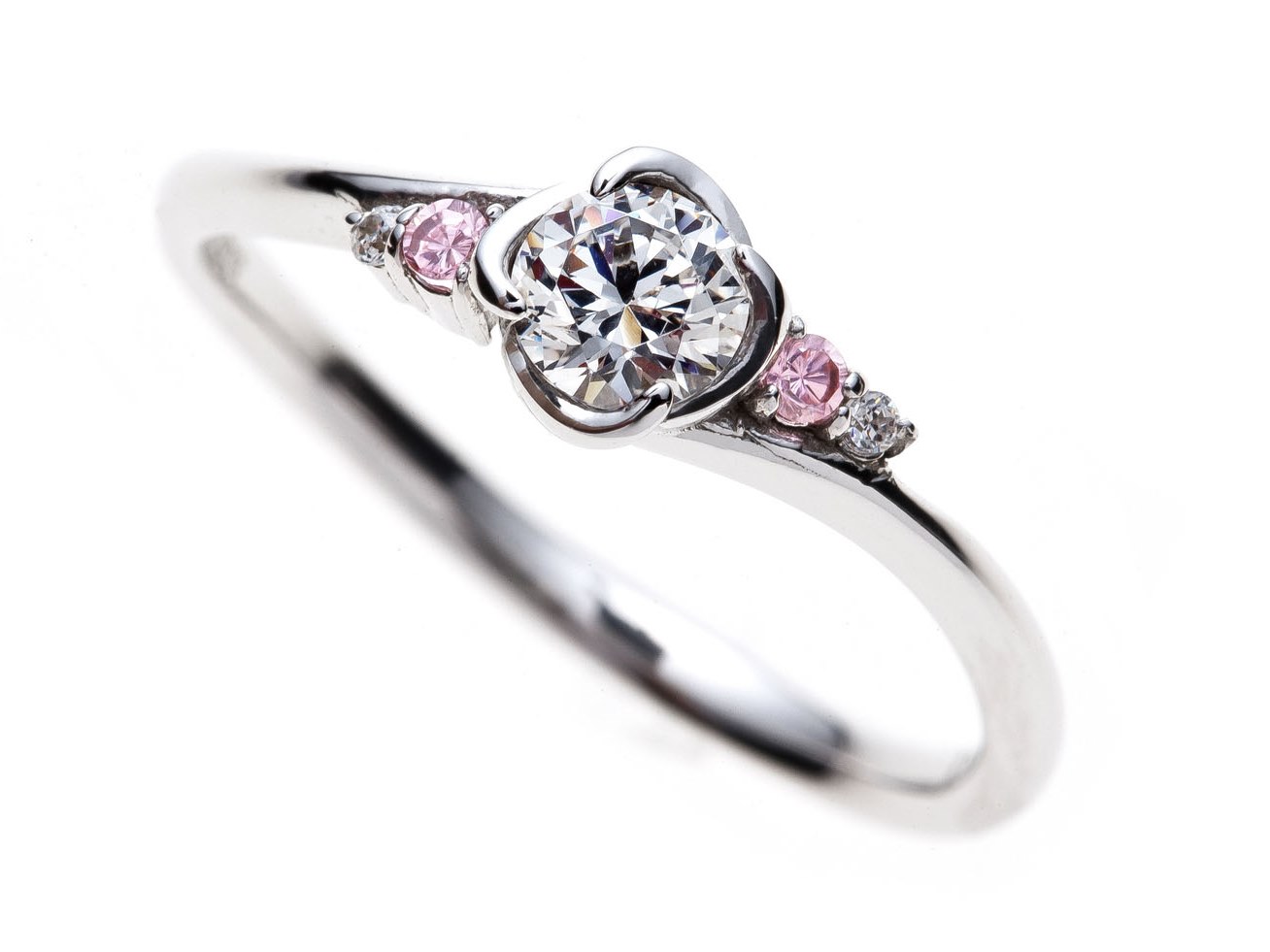 センターダイヤを囲む花びらを模った飾りと、サイドのピンクサファイヤが最上のキュートさを演出。Sラインが指をキレイに美しく見せてくれます。