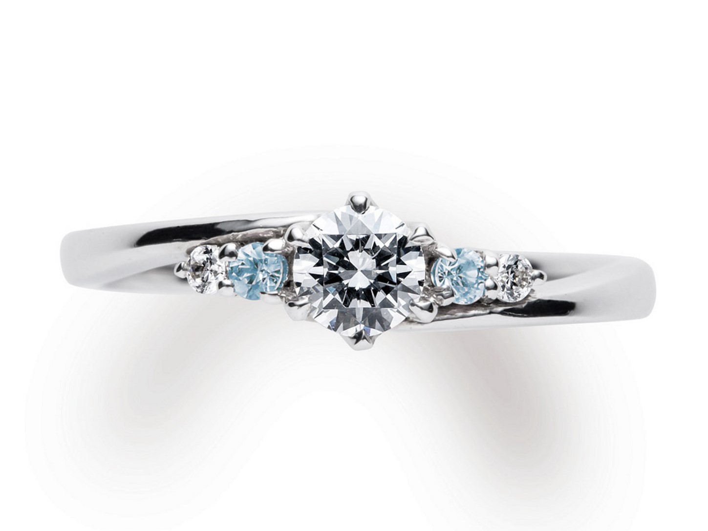 美しいSラインカーブに点在するよう配置されたメレ石が華やかで、爽やかなアイスブルーダイヤが指を美しく彩ります。