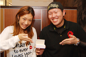 「雑誌で見た時にすごく可愛いリングで、すぐこれにしようと決めました。」という直樹さまがお選びになられたのは、SANJIオリジナルブランド「flowers」のエンゲージリング。 ピンクサファイアとダイヤモンドが両サイドにあしらわれたかわいらしい「リトルバレリーナ」でした。キュートな笑顔がステキな文香さまにぴったりのリングです。