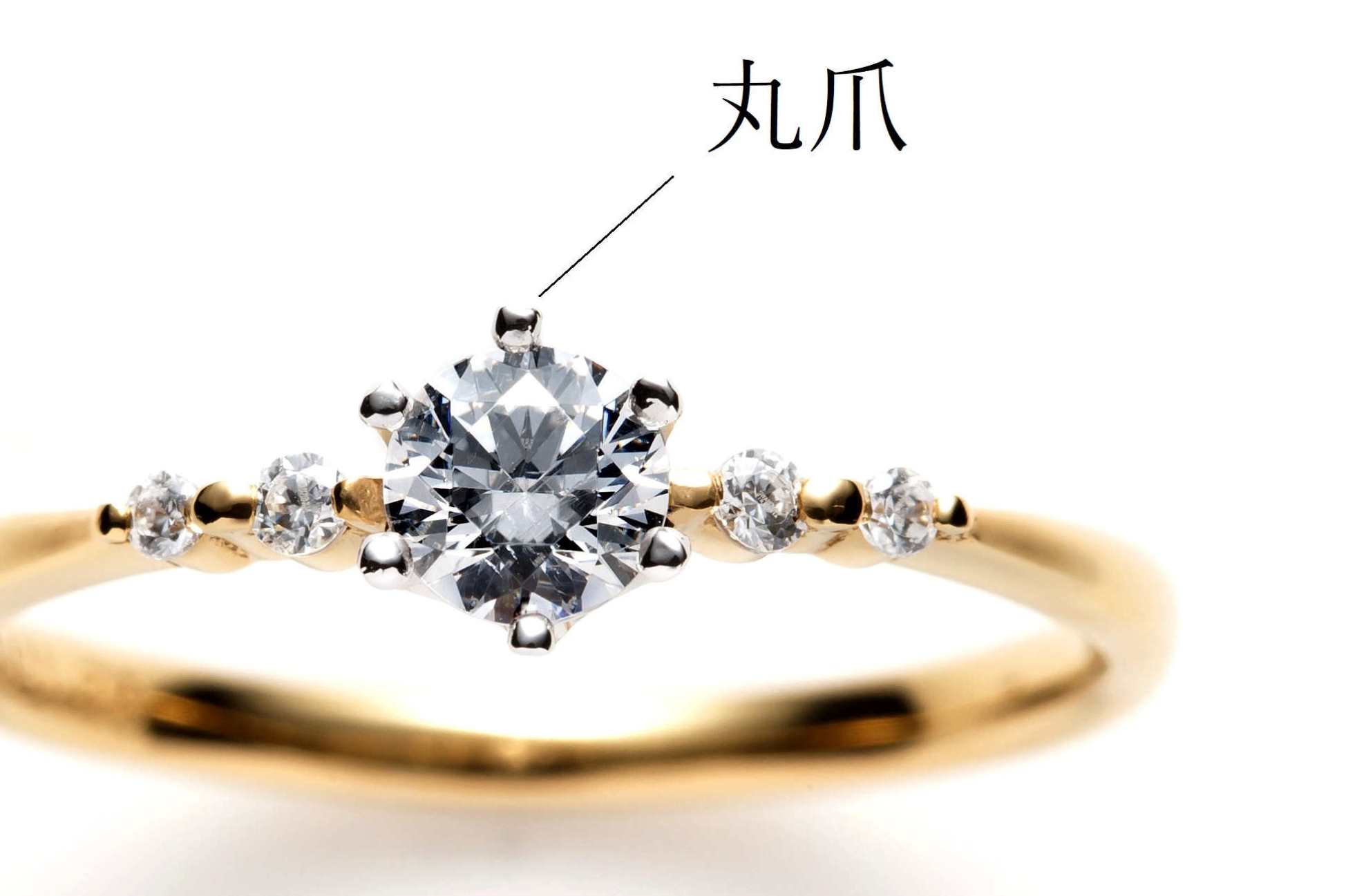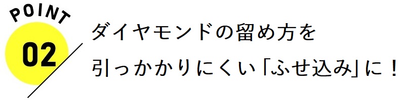 ふせ込みとは、石の周りをぐるっと地金で覆う留め方です。多くの婚約指輪は、丸爪で6点や4点で留める方法ですが、ふせ込みにすることで、引っかかりをさらに防ぐことができます。