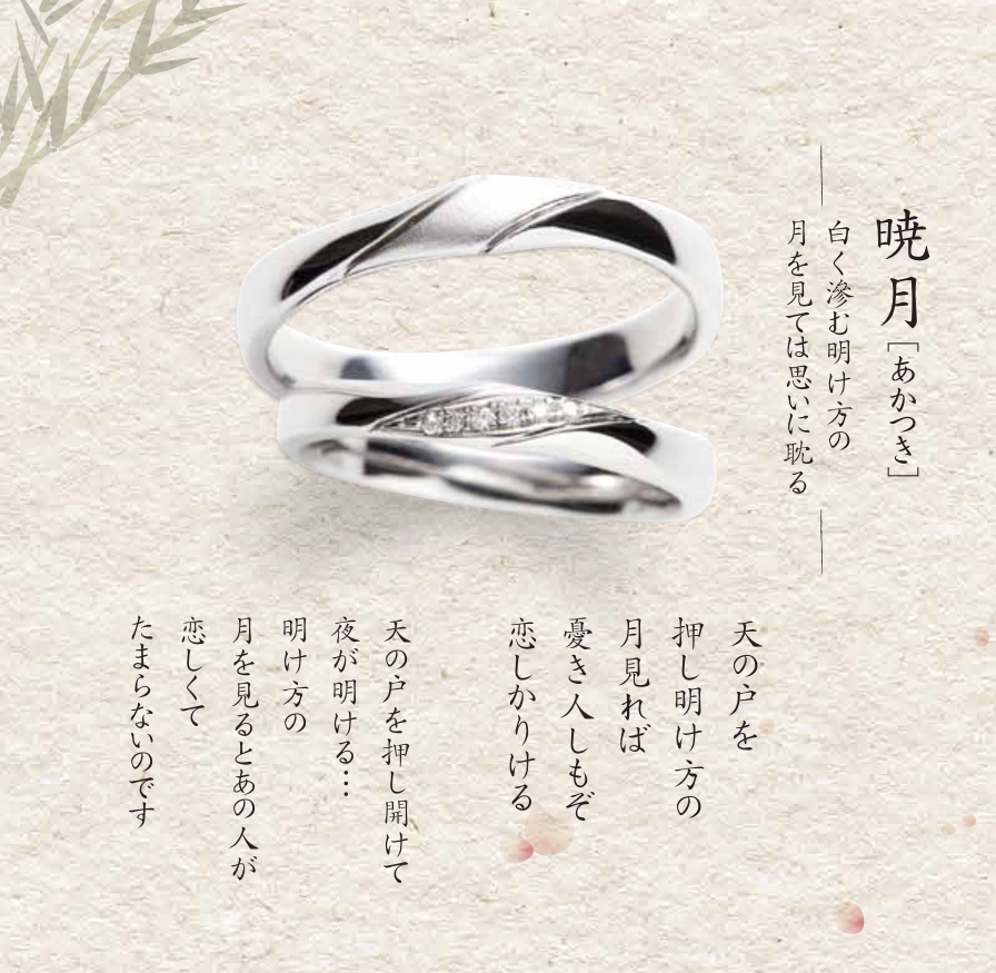 月に映した恋する想いをしたためた和歌の世界観を表現。その奥ゆかしく繊細な想いをデザインに込めて、優美なフォルムの結婚指輪が誕生しました。