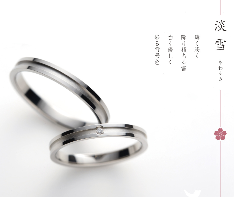 ふたりで過ごす季節の移ろい、ふたりで見つめる美しい日本の四季の姿をモチーフにデザインされた【雪月花】のブライダルリング。さりげない日々の変化にも彩りを感じ、細やかな喜びに幸せを感じられる日常を。