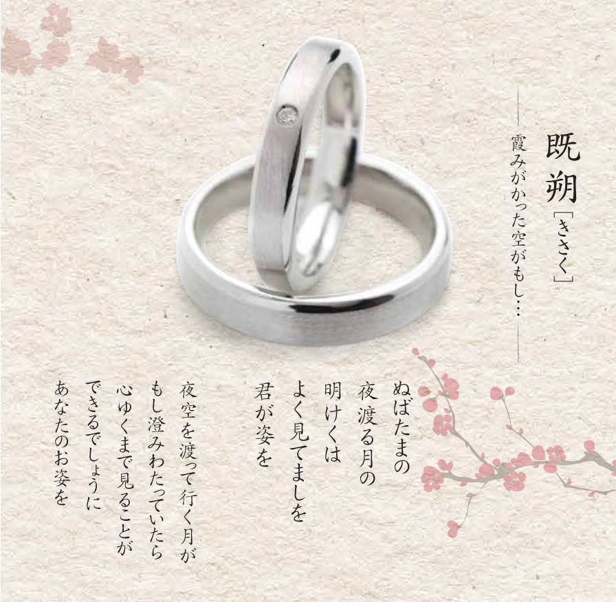 月暦のブライダルリングはひとつひとつに「月と恋」を詠った和歌があり、その内容をイメージしてデザインされています。