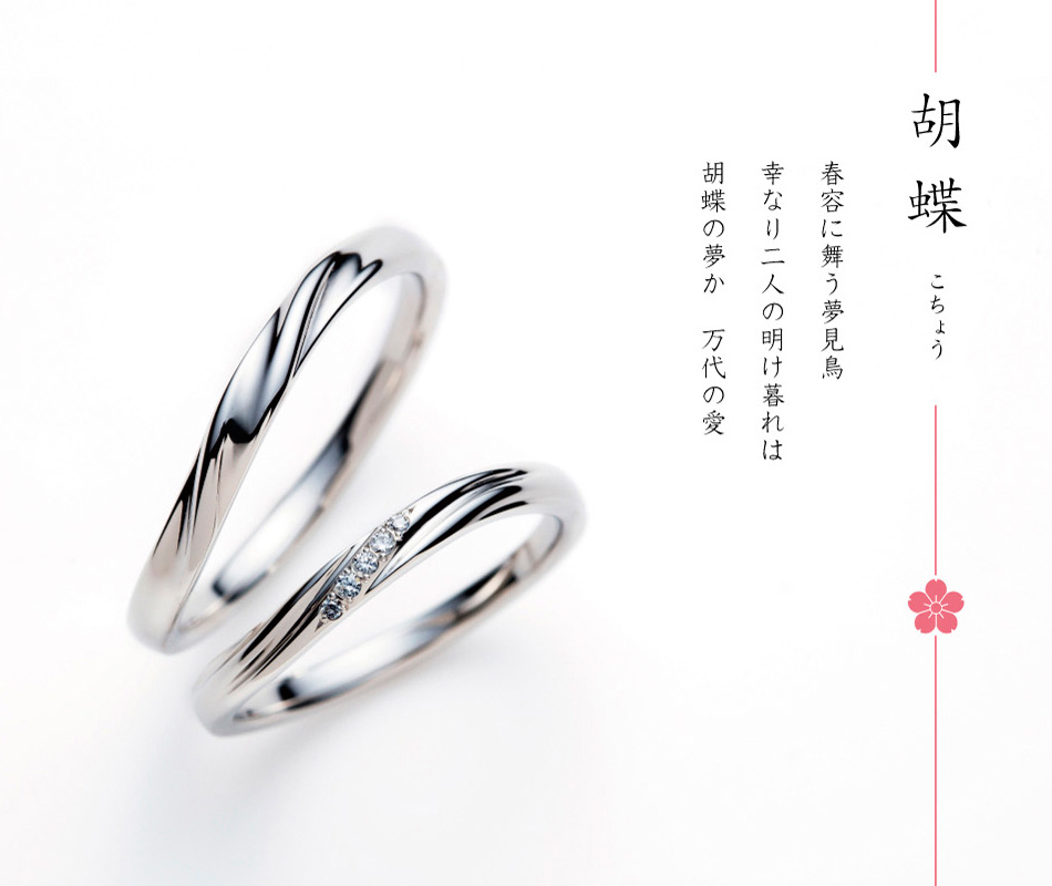 日本の四季の美しい風景、その一瞬を切り取った和の趣の落ち着いたデザイン。「胡蝶」は穏やかな春の空に蝶が優雅に舞い、それがあたかも二人の永遠の愛を象徴しているかのように見える様子をモチーフに作られました。