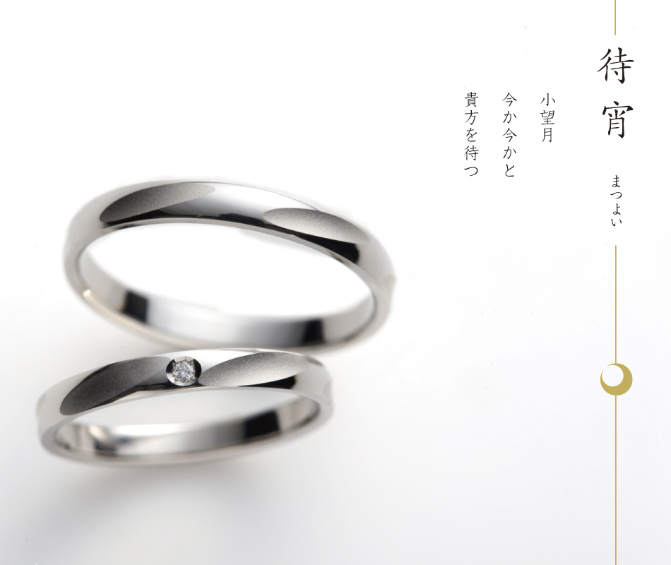 等間隔にリング表面を彫り抜いたようなデザインが印象的な「待宵」。彫り抜いたカット面はホーニングマットのつや消し加工でアクセントを付け、その他を美しい鏡面加工にすることであでやかな雰囲気を演出しています。