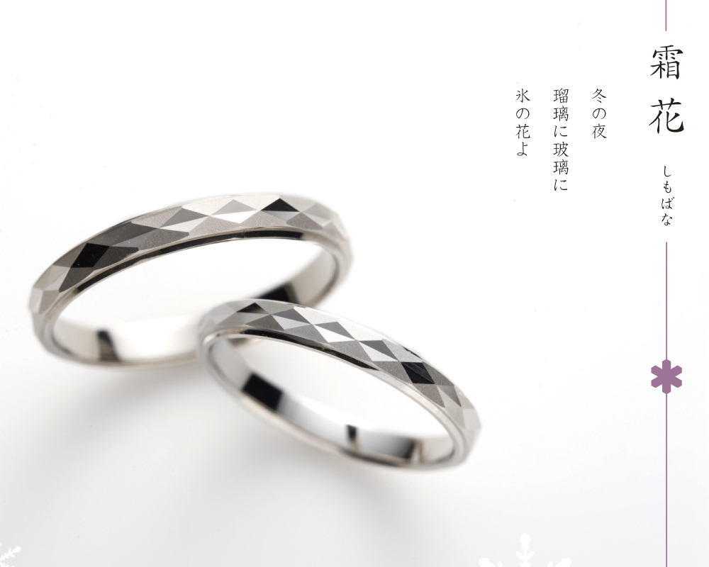 冬、ガラスに出現する美しい“氷の花”をイメージして作られた「霜花」のマリッジリング。キラキラと輝く規則的なカットが、角度によって異なる反射模様を表現して見せてくれるデザイン特徴のあるリングです。