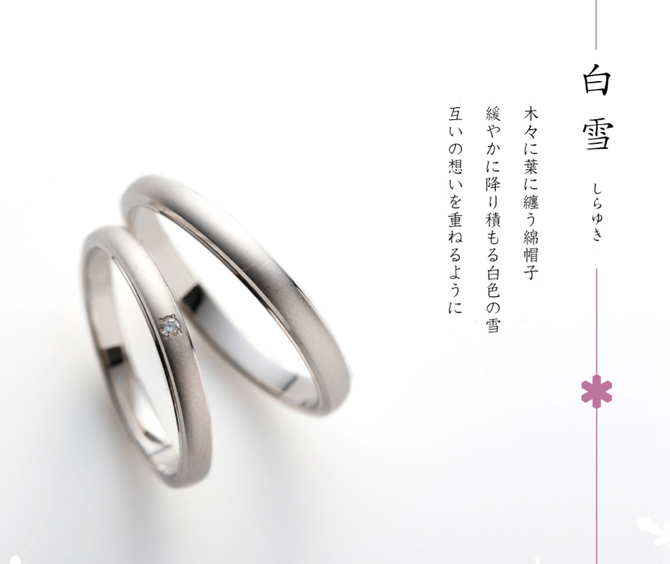 日本の四季の美しい風景、その一瞬を切り取った和の趣の落ち着いたデザイン。「白雪」は、木々や葉にふわふわと綿のように降り積もった雪。そんな雪は二人の想いを重ねているかのよう。綿帽子を纏う花嫁にも重ねてイメージした指輪。