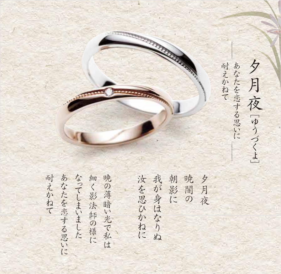 月暦のブライダルリングはひとつひとつに「月と恋」を詠った和歌があり、その内容をイメージしてデザインされています。