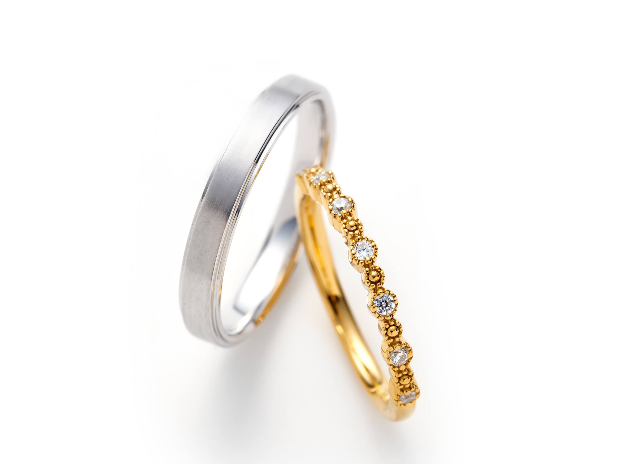 恋人同士だった時の思い出も、家族になってからの思い出も全部大切にしたい…そんな想いを込めた「Lumiere」リュミエールのブライダルリングは、YGやPGを使用したアンティーク調のデザインが優しい雰囲気を醸し出すブランド。肌なじみの良い指輪は”いつも自然体で居たい”ふたりにお似合いです。